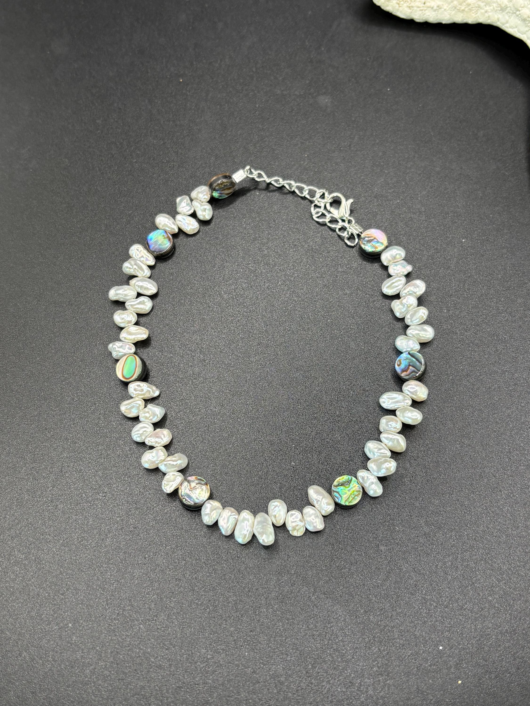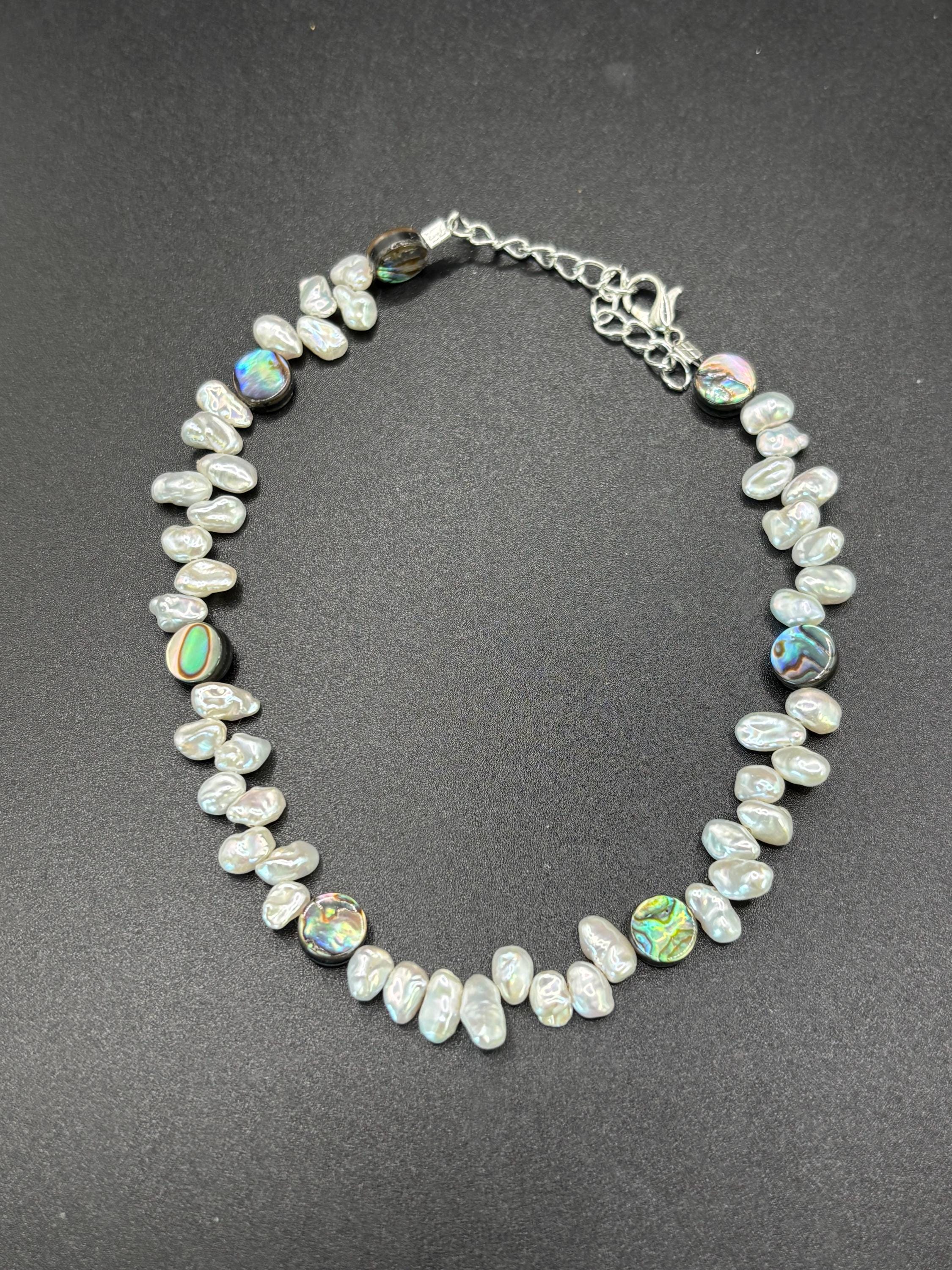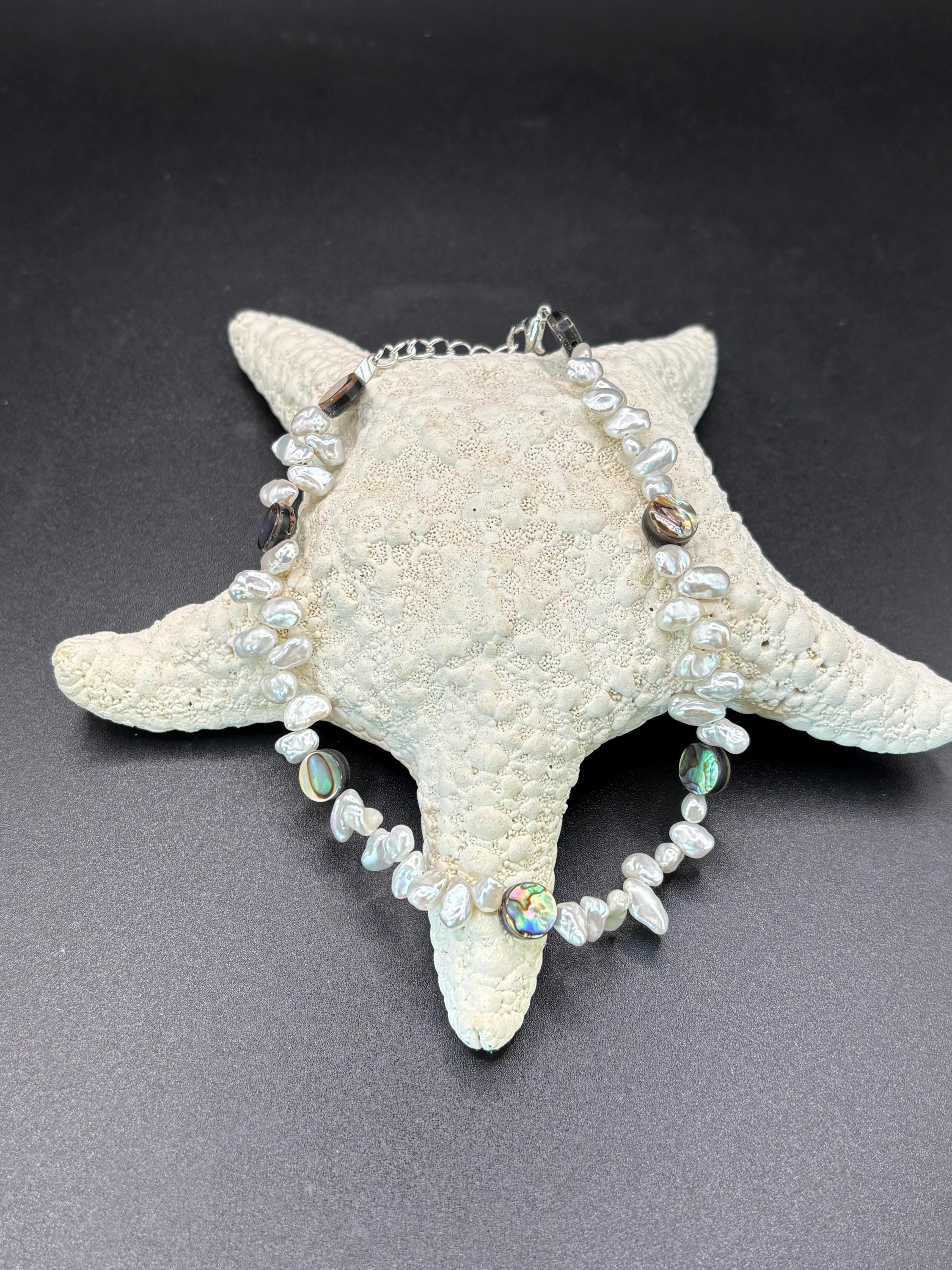 This pretty ankle bracelet is made with Rice Pearls and Abalone shell.