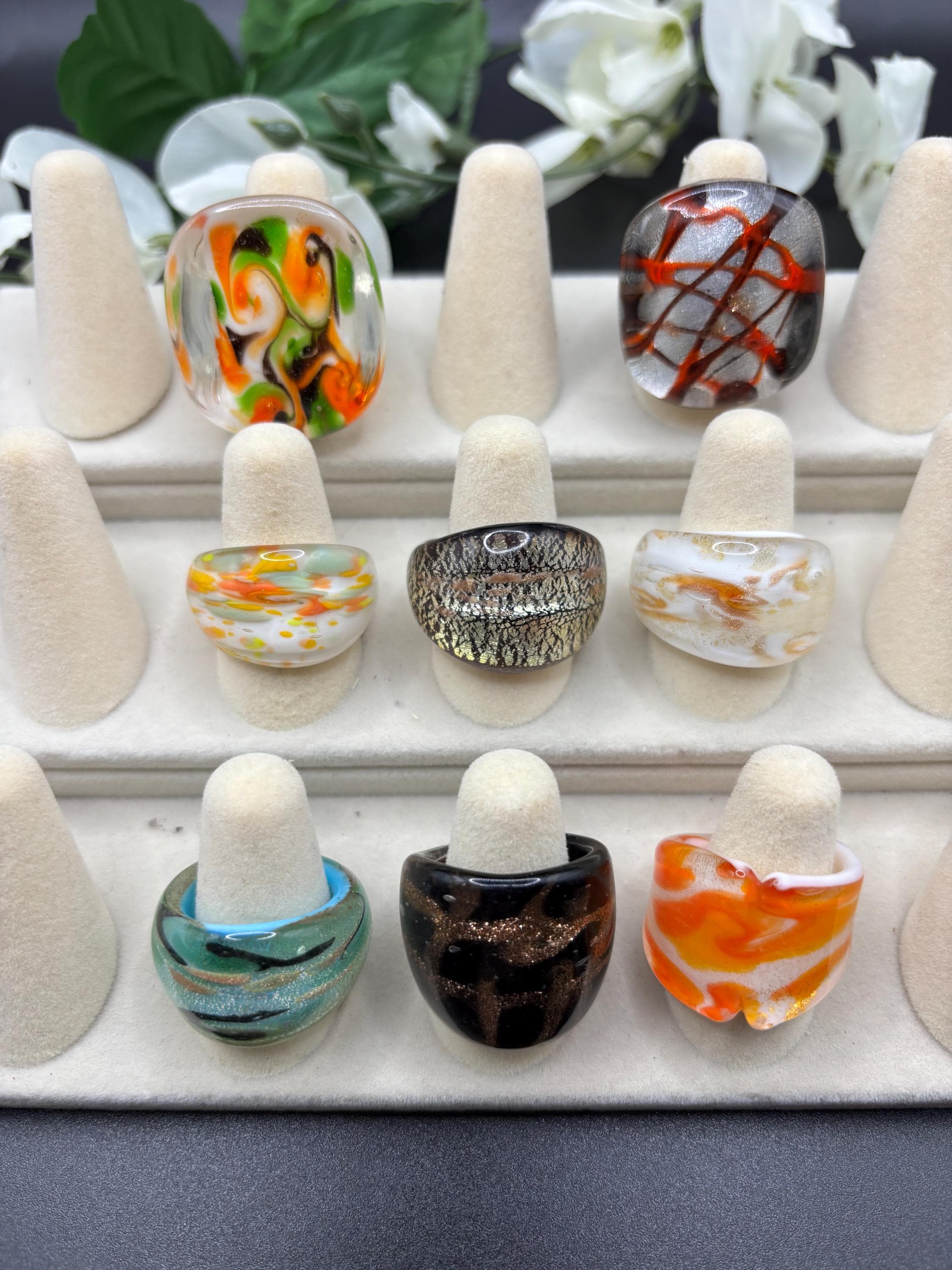 There will be many options by style, color and ring type. There are Millefiori designs as well as Murano inspired glass rings to chose from.