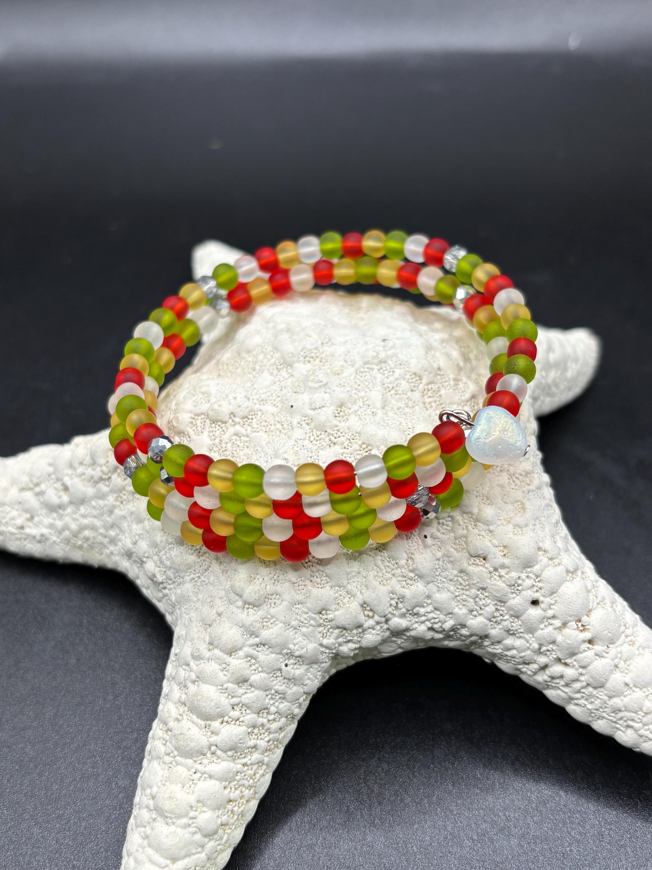 This beautiful Memory Wire Seaglass bracelet is made with multi colored Seaglass . There are different listings with the options I have available. This one has a white iridescent glass heart charm.