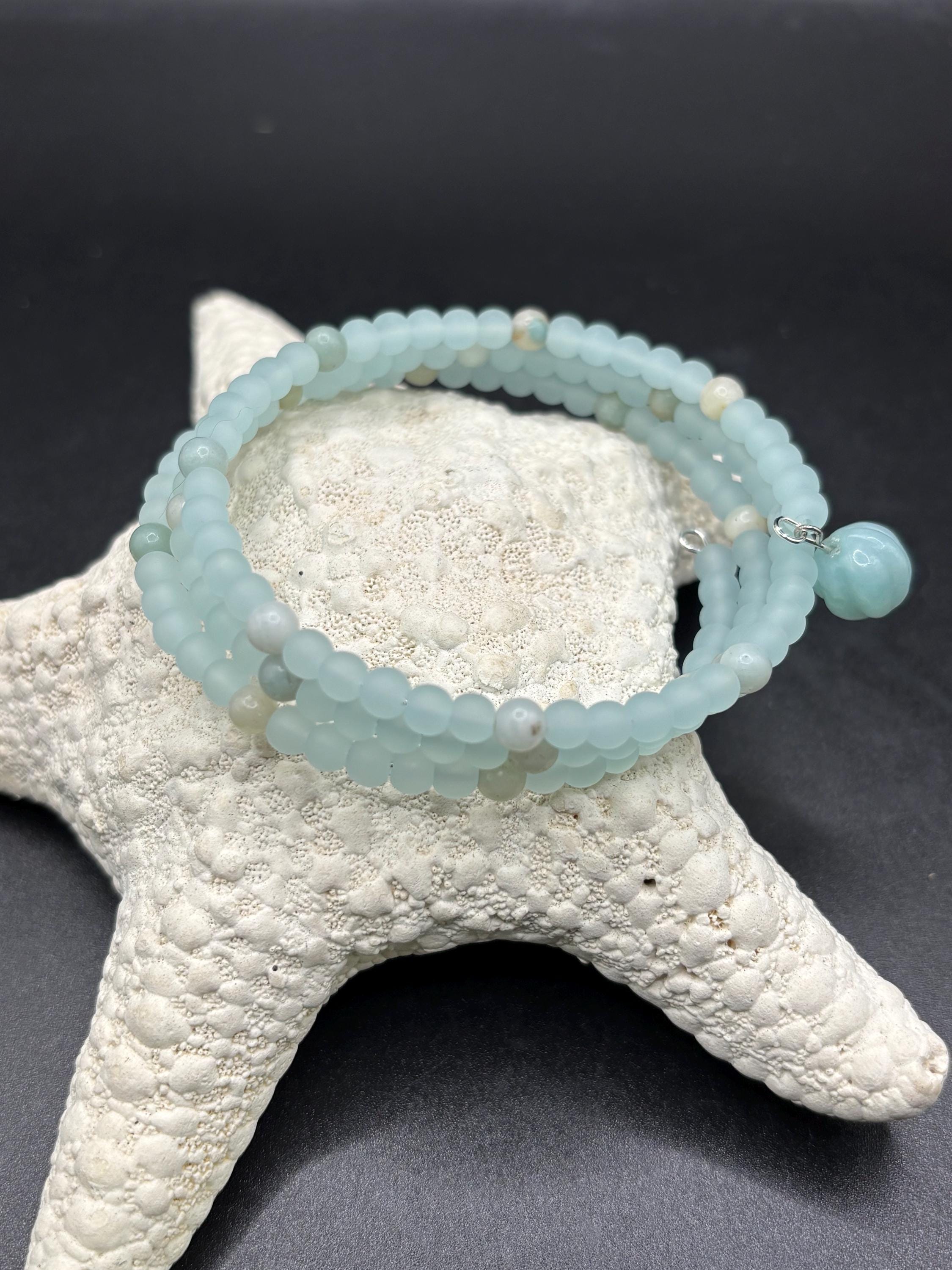 This beautiful Memory Wire Seaglass bracelet is made with seafoam colored Seaglass and has amazonite gemstones . There are different listings with the options I have available.