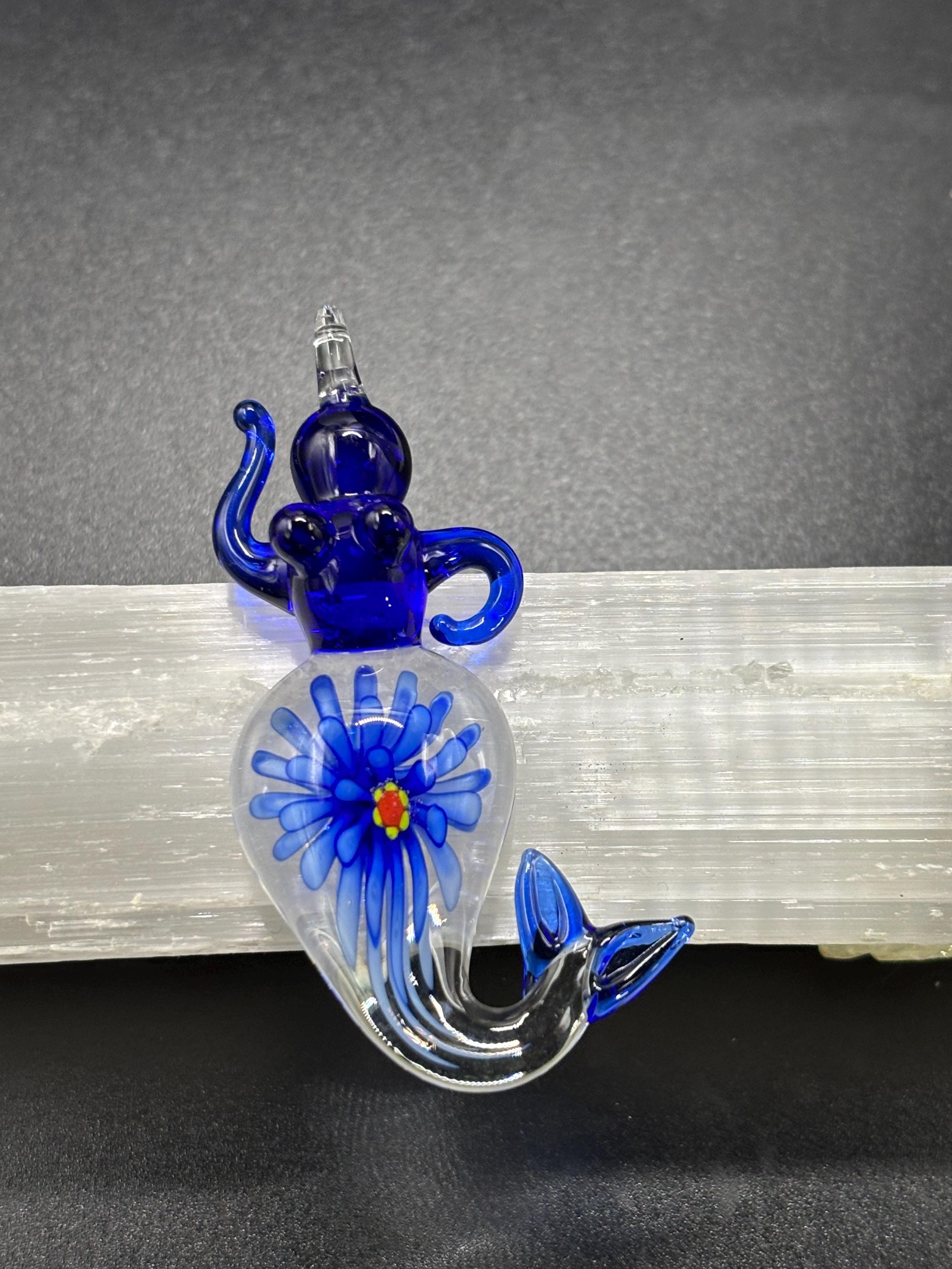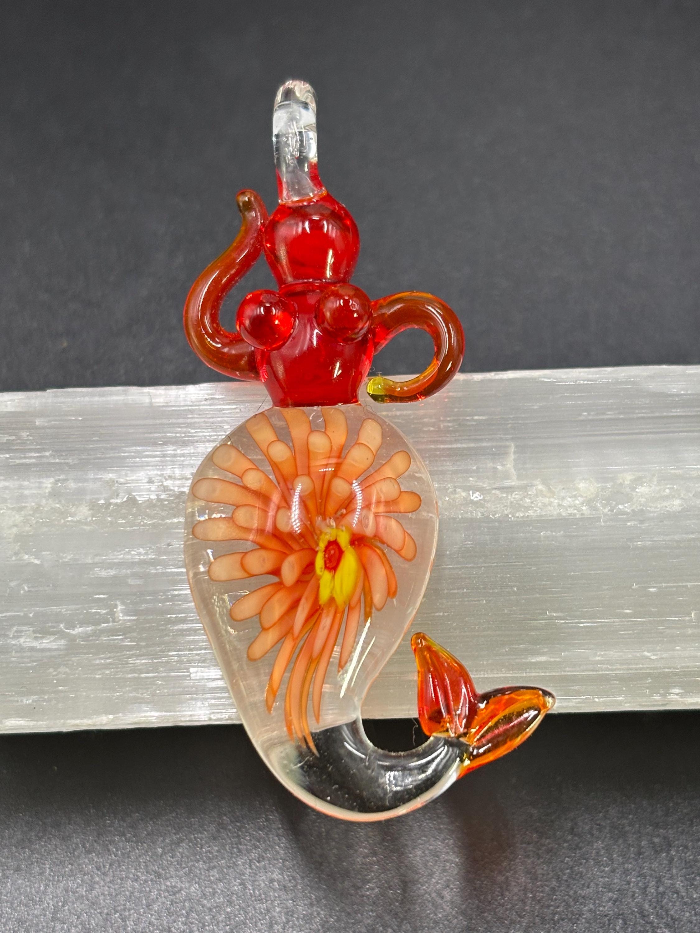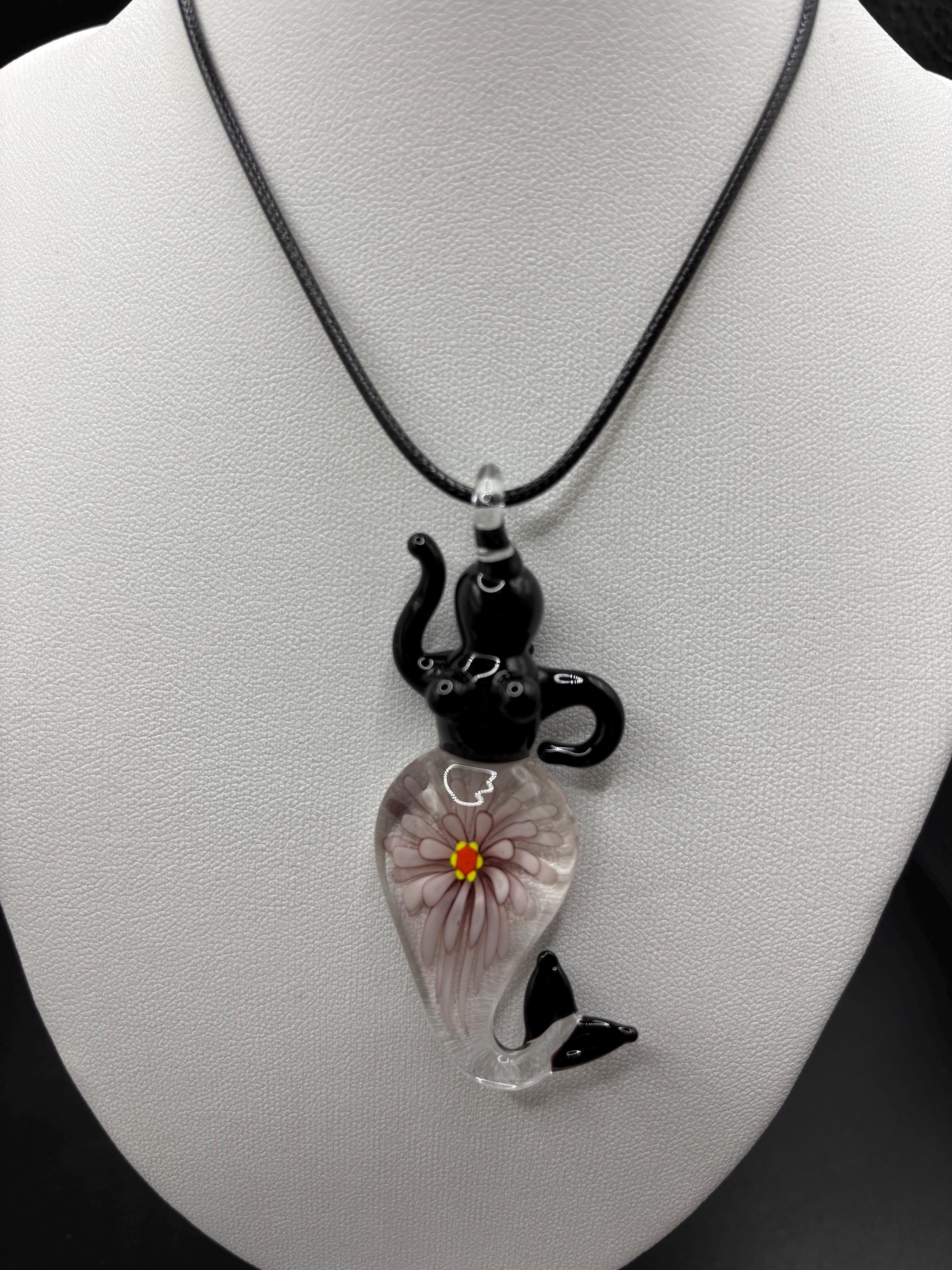 These necklaces are made in the shape of a mermaid with a glass flower accent.
